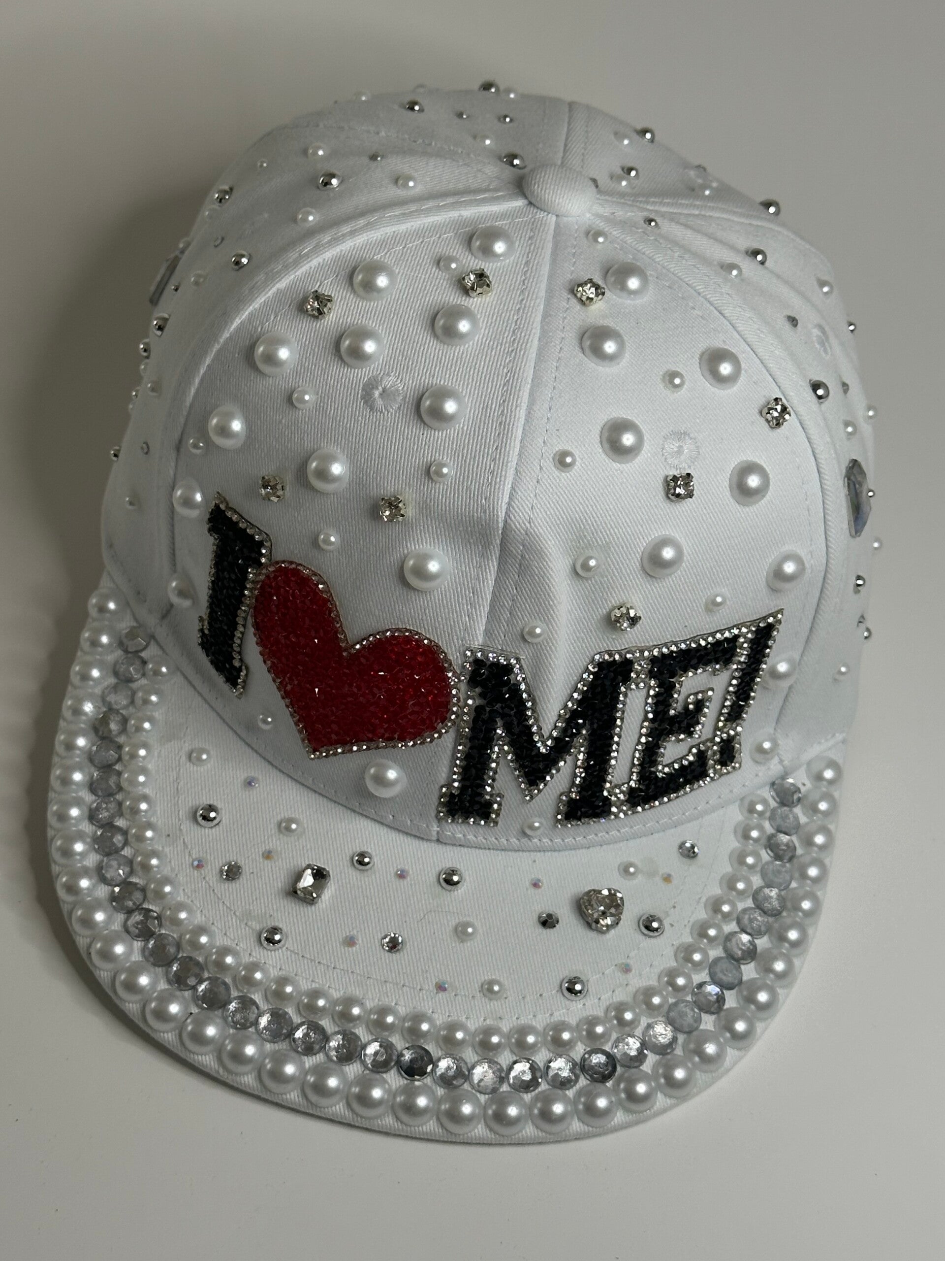 "I LOVE me" White BLing Snapback - Pearl & Rhinestone Statement Hat
